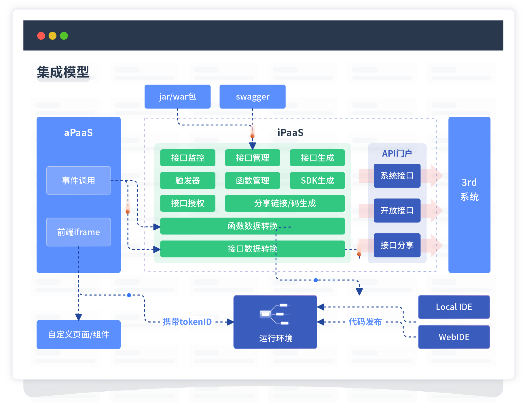 集成模型包括平台本身前、、、、、、、、后端能力的扩展,,,,,,,,也支持通过API门户和第三方系统进行交互。。。。。。