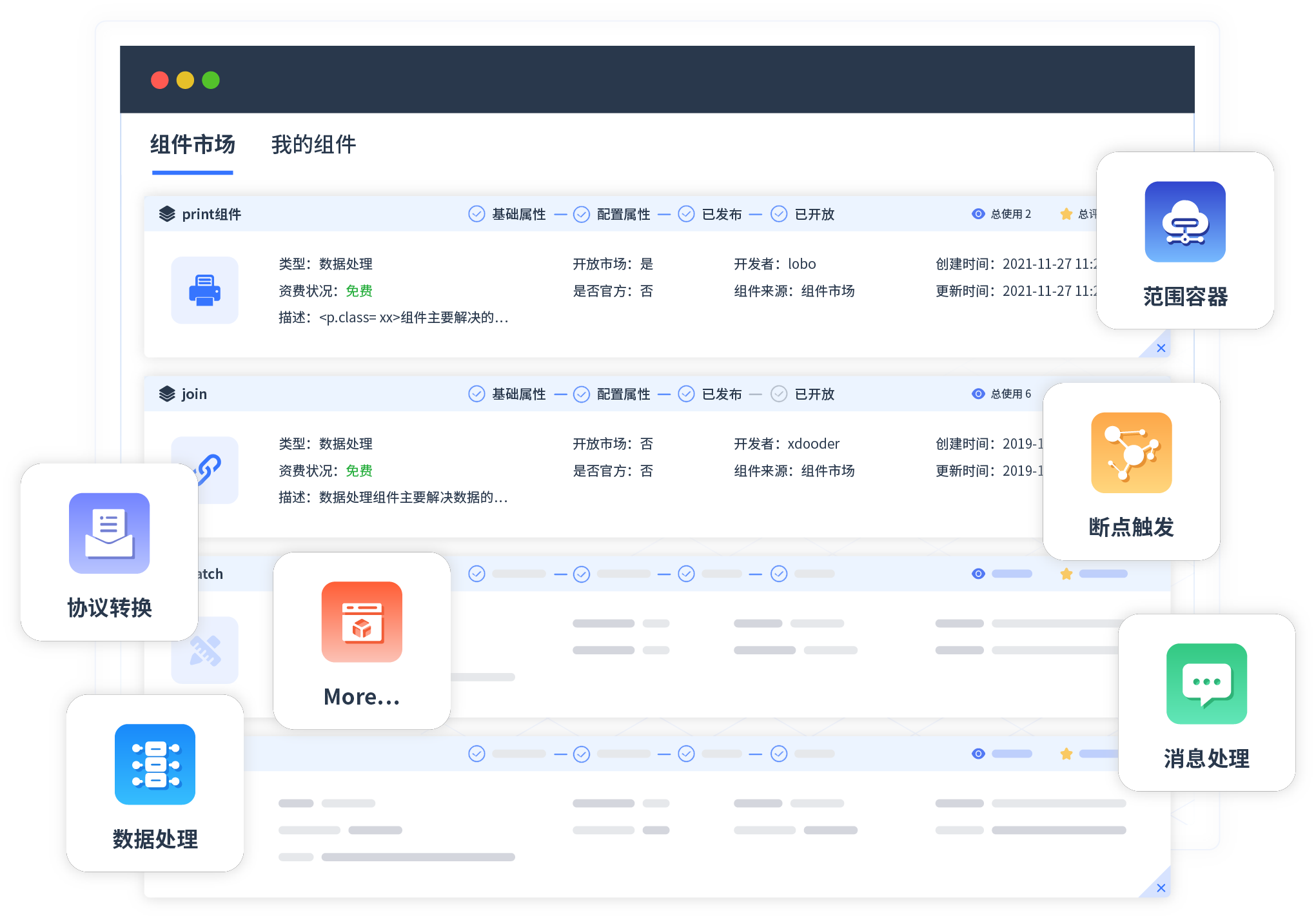 针对集成场景,,,,NO钱包提供组件市场,,,,,,,,,,例如协议转换、、、、、、、消息处理、、、、、、、、文件操作等。。。。。。。。。。除平台提供的组件外,,,,,,,客户可以自定义所需组件。。。。。。。。。