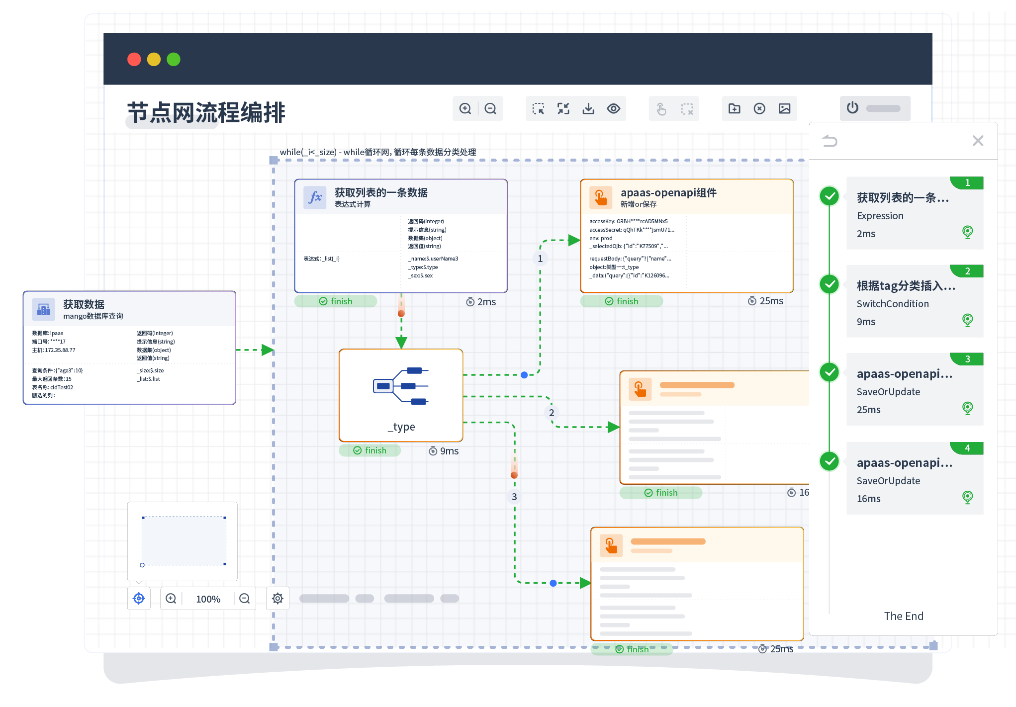 针对集成场景,,,,,,,,,,,组件定义后支持进行流程编制,,,,,,,,,,不同于传统代码方式,,,,,,,,,通过图形化展示,,,,,,,,,,,支持在线调试、、、、、、、、、、日志查看和运行回放。。。。。。