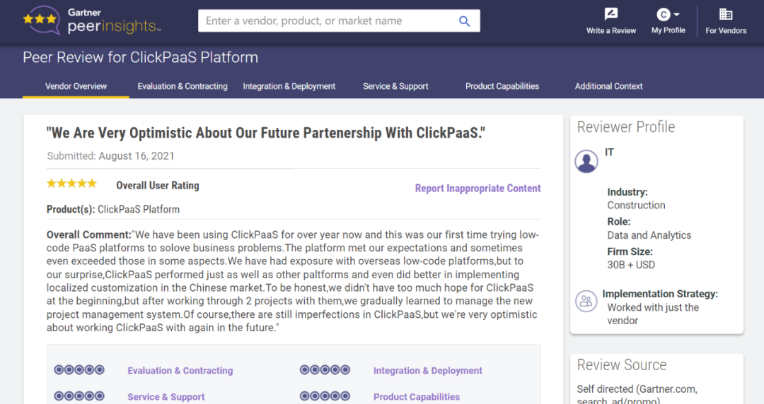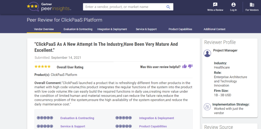 Tips::::::::::::【Peer Insights】——用户对企业IT产品和服务发布真实评价的平台。。。。。。。。。。目前已有355个市场,,,,,,,,,255,000条经过验证的评价。。。。。。。。。。每一条评价Gartner会针对参评企业营收规模及参评人员信息做验证、、、、、评价内容做多维核实。。。。。。