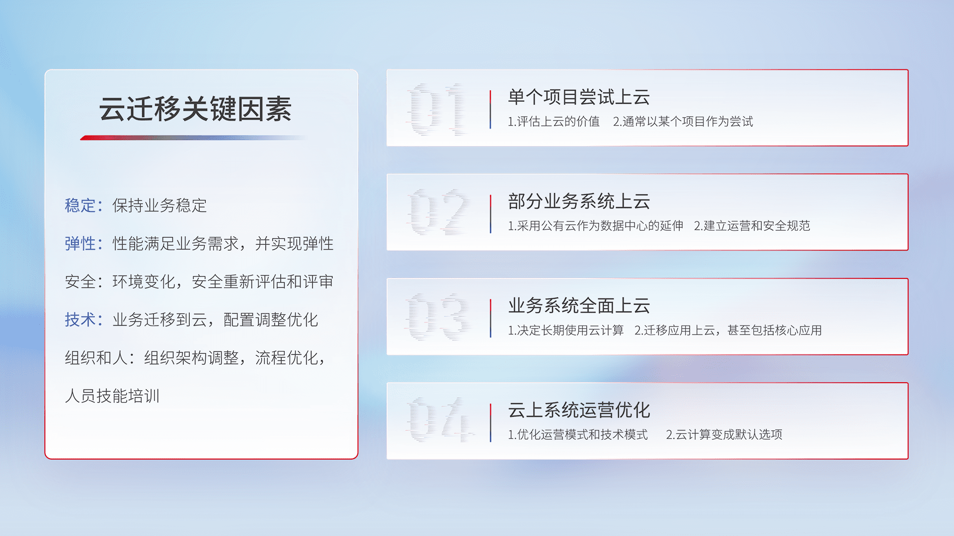结合实际业务,,,从规划设计、、、、云平台选型、、、、云原生改造、、数据迁移、、、、集成交付,,,,迁移全过程为客户识别最佳上云路径,,,,做好风险识别管理,,,设计网络架构、、身份权限、、、、安全审计合规、、、、操作审计、、日志审计、、、、监控告警策略、、多站点容灾设计等,,,,对云上基础设施进行整体规划,,提升IT治理水平,,,以满足弹性、、高可用、、高性能的需求。。