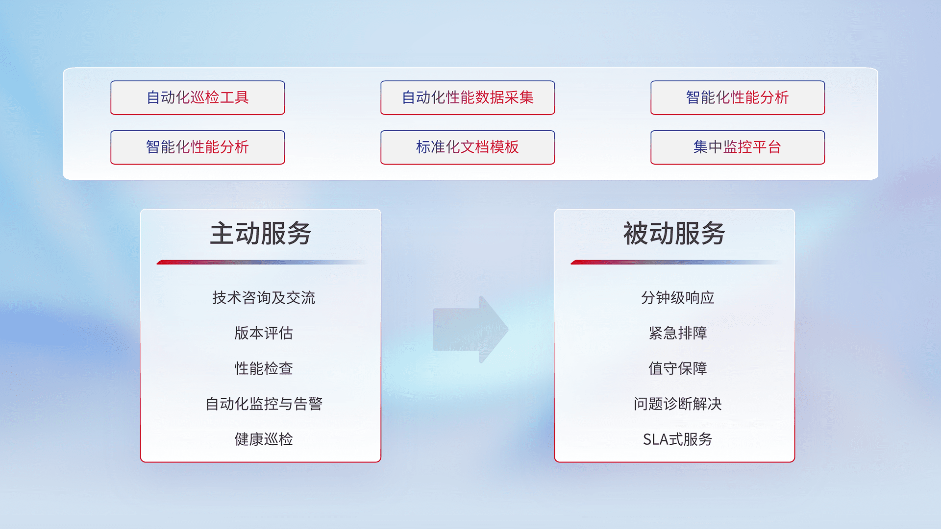 智能化工具和标准化文档,,保障服务质量,,,,提供主动服务(包含技术咨询、、、版本评估、、、性能检查、、自动化监控与告警、、、、健康巡检)和被动服务包含(分钟级响应、、、、紧急排障、、、、值守保障、、、问题诊断解决、、、SLA服务)。。。